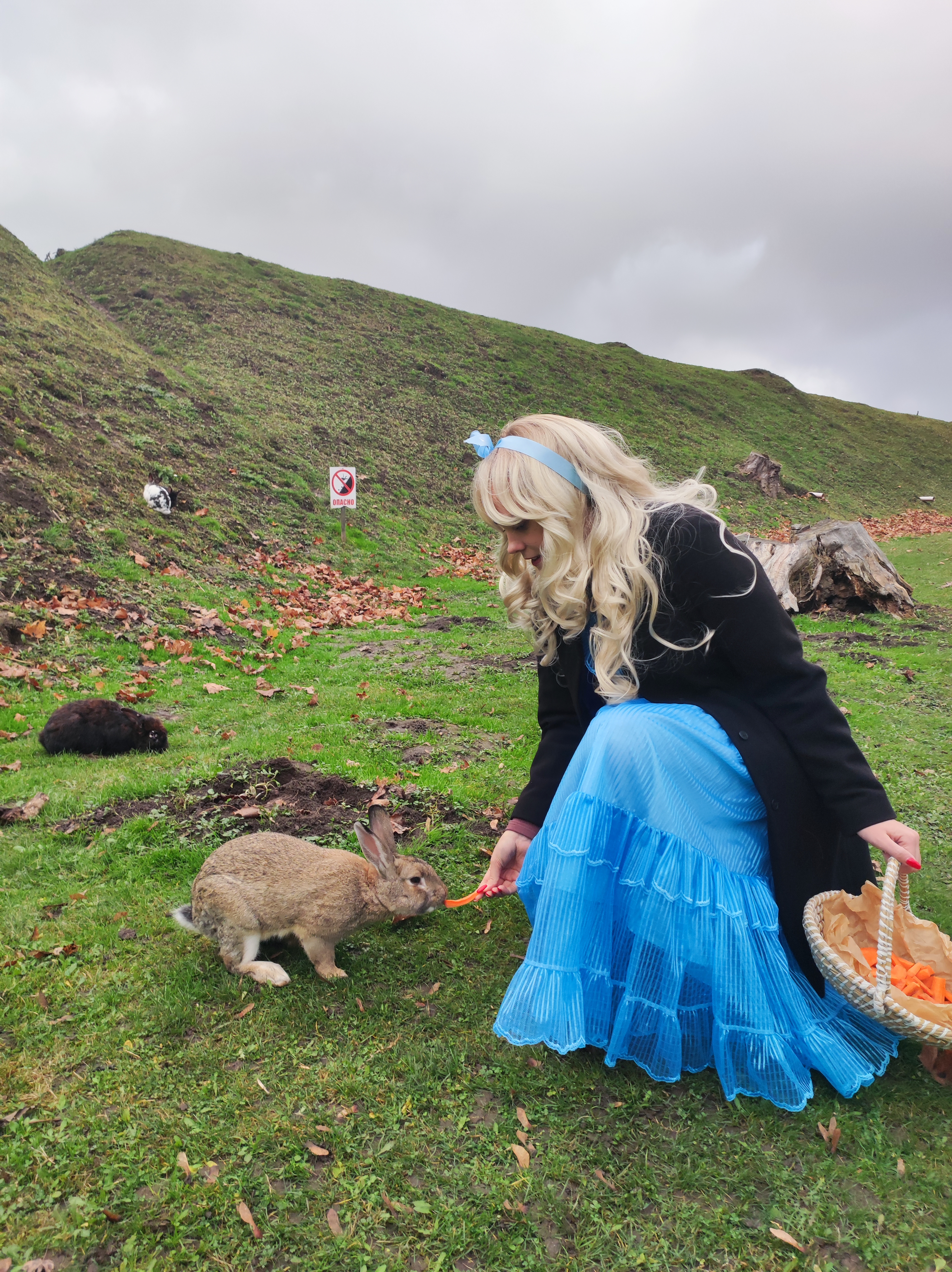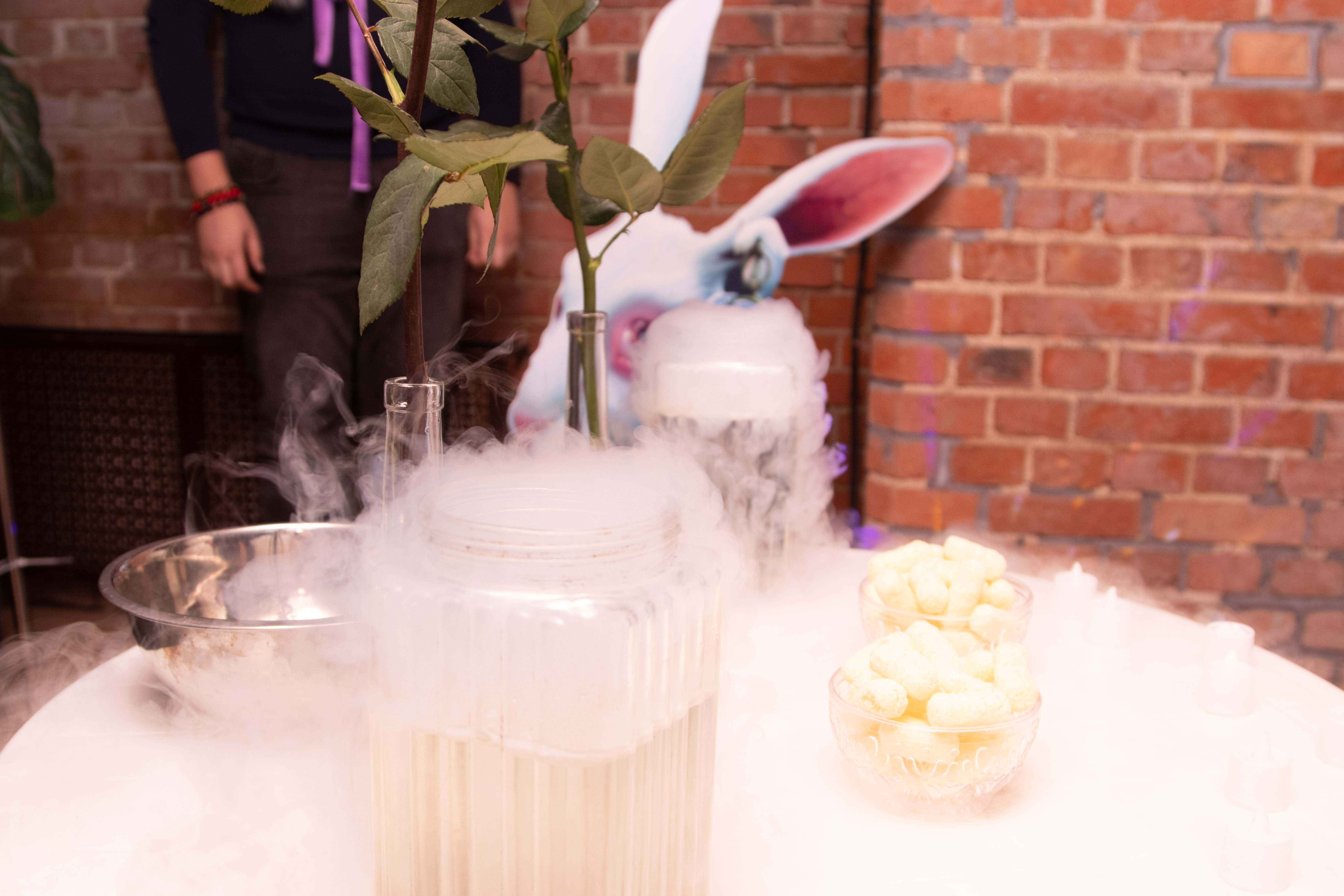 Мы начнем нашу программу с кормления кроликов угощением, приготовленным Алисой, затем ребята получат ключ от "кроличьей норы", где будет находится локация "безумное чаепитие", здесь участники квеста узнают свою главную цель - получить подсказки, найти Бармаглота и приручить его, а также пройдут несколько тематических испытаний, попробуют угощения, получат свитки с заданиями.